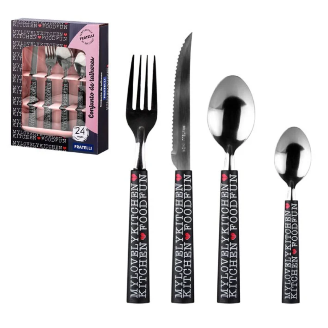 - Composição: 24 peças, incluindo facas, garfos e colheres para mesa e sobremesa