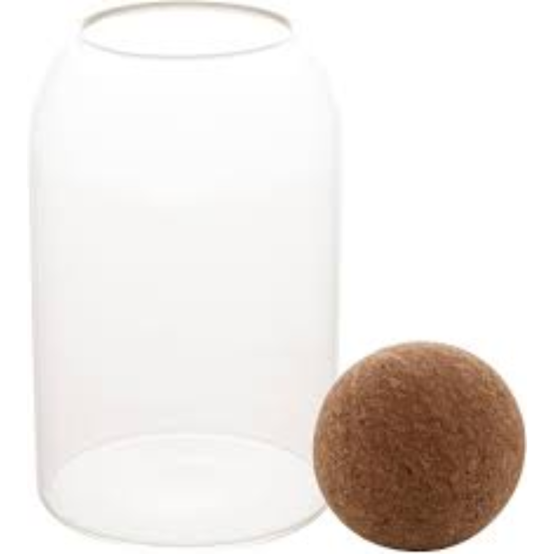 - Composição: Pote de vidro com tampa esférica de rolha de bambu